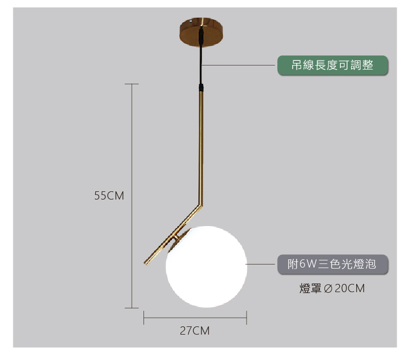 品名 米德蘭單吊燈 (附三色光燈泡) 材質 金屬電鍍燈體、玻璃燈罩 尺寸 燈體約27cm * 20cm 燈罩高約55cm 附線長約 90cm (可調整) 光源 內附LED 6W三色光燈泡 *1 適用 約1-2坪