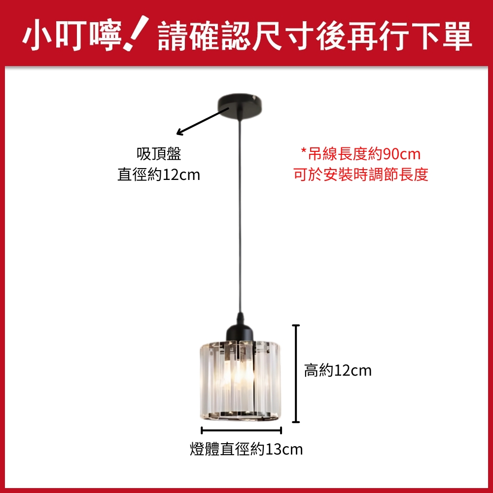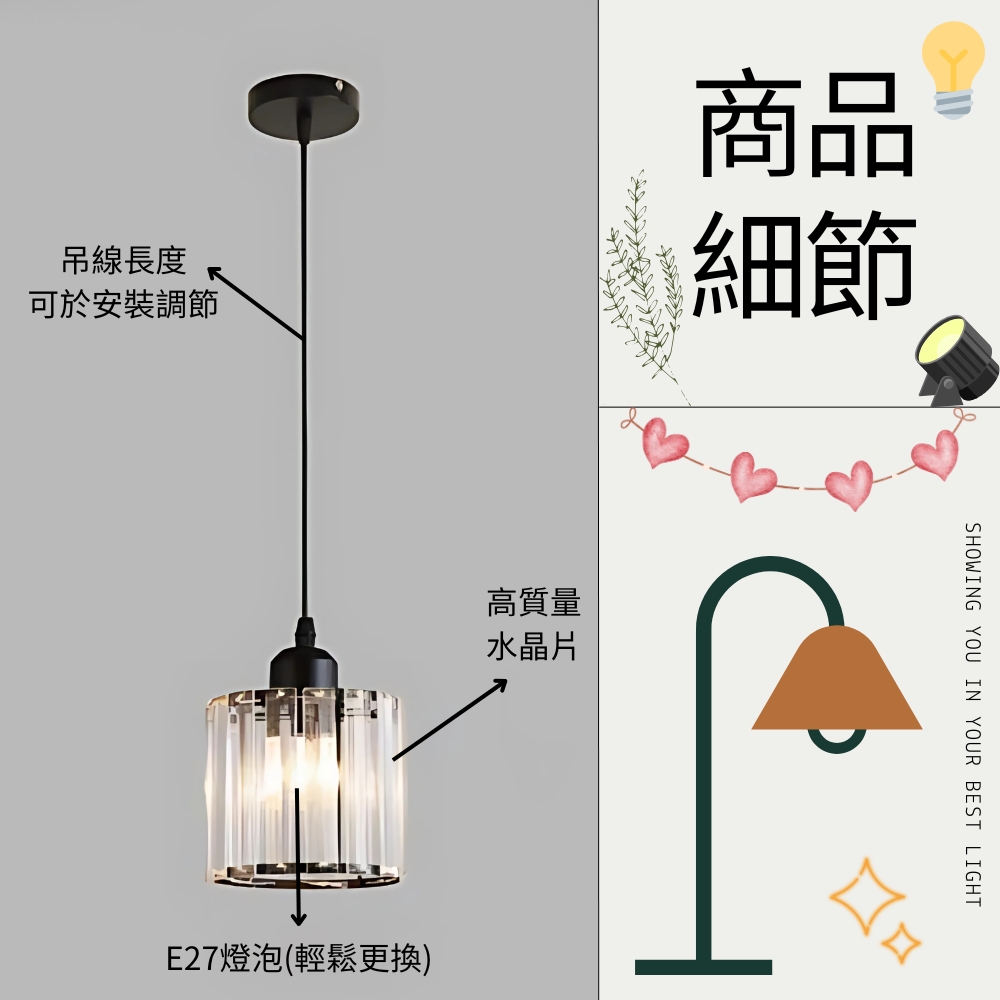 品名 維納斯(黑)單吊燈 材質 金屬燈體 + 水晶片燈罩 尺寸 燈罩直徑約13cm*高度約12cm 燈盤直徑約12cm (附線約90cm 可縮短調整) 光源 需另購E27燈頭燈泡*1 適用 適用約1-2坪