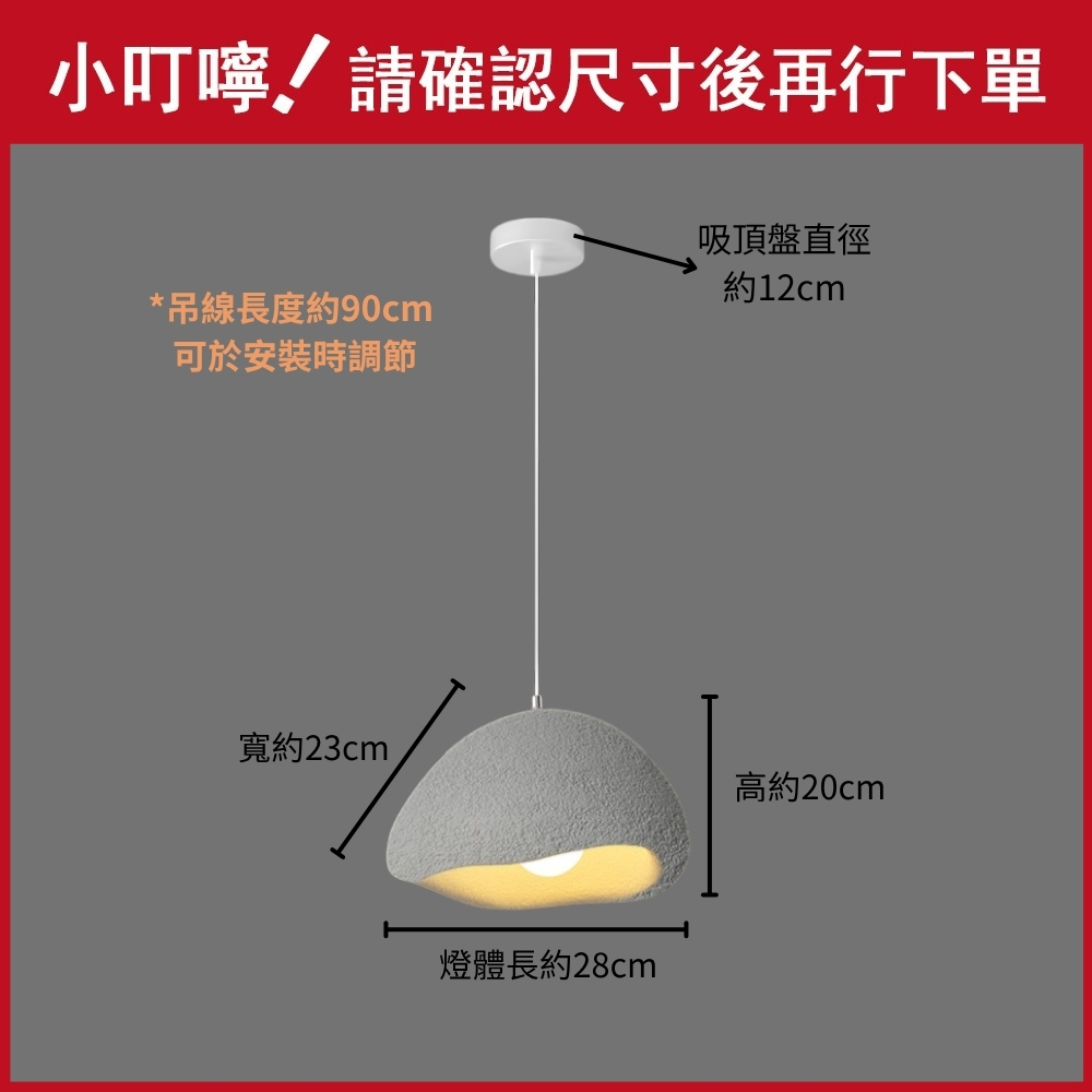 品名 獨處(灰色)單吊燈 材質 金屬燈體 + PVC燈罩 尺寸 燈體長約28cm * 寬約23cm * 高度約20cm 吸頂盤直徑約12cm (附線約90cm 可縮短調整) 光源 需另購E27燈頭燈泡*1 適用 適用約1-2坪