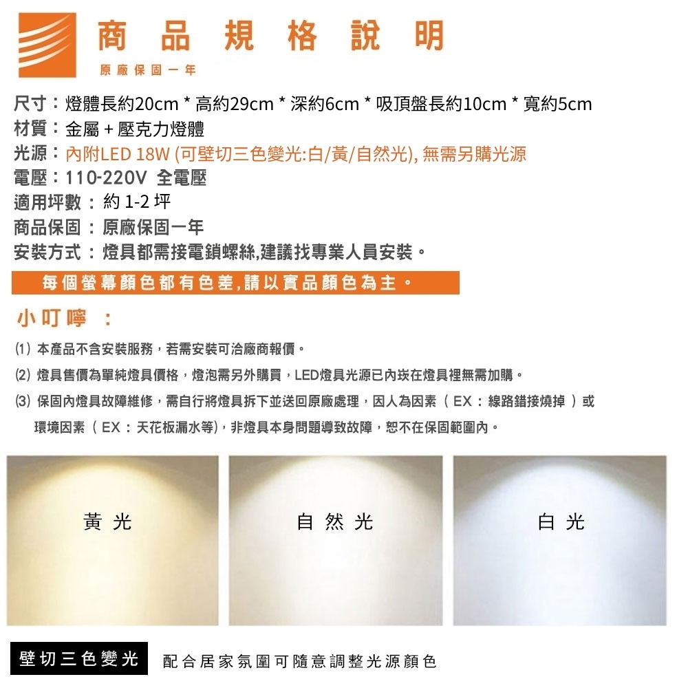 品名 LED 18W 永恆壁燈 (三色光) 材質 金屬燈體 + 壓克力燈罩 尺寸 燈體長約20cm * 高度約29cm * 深約6cm 吸頂盤長約10cm * 寬約5cm 光源 內附LED 18W (可壁切三色變光:白/黃/自然光) 適用 適用約1-2坪內