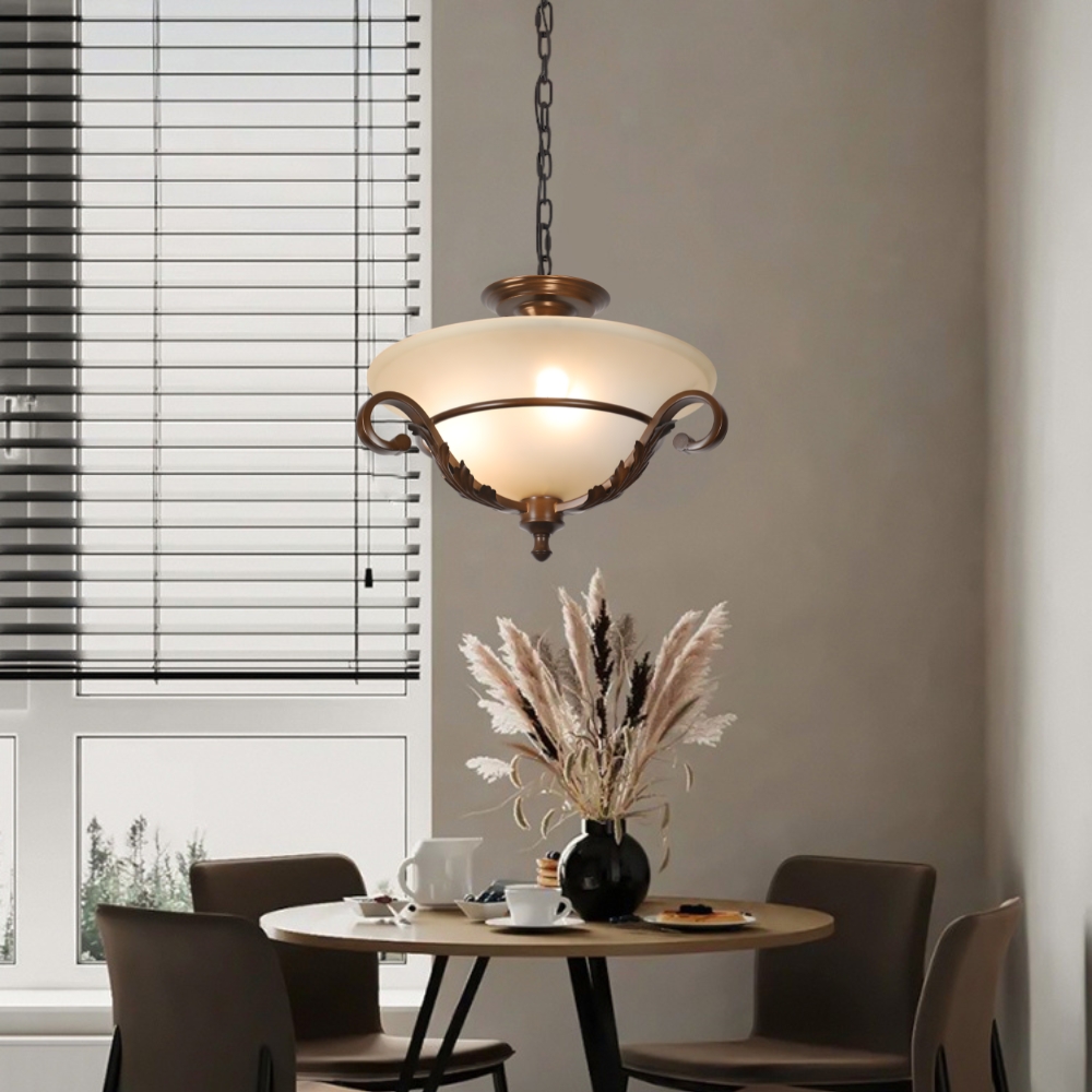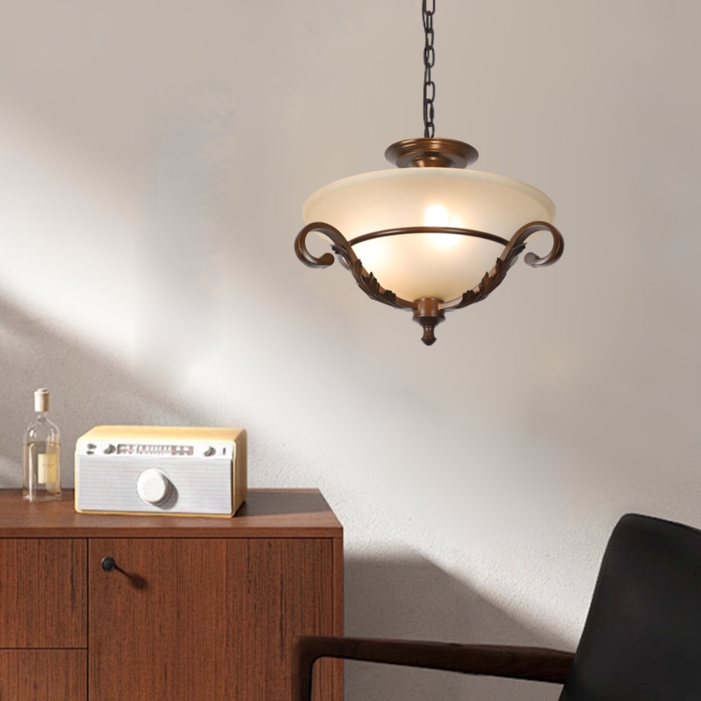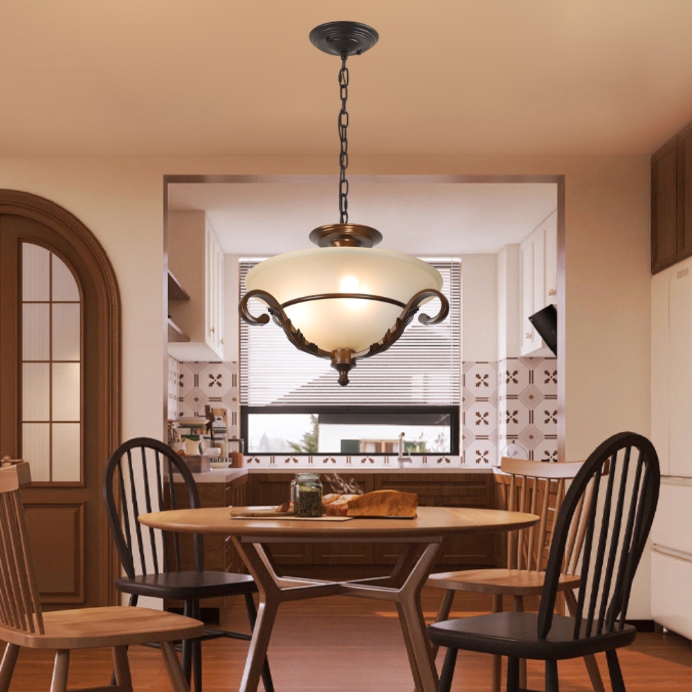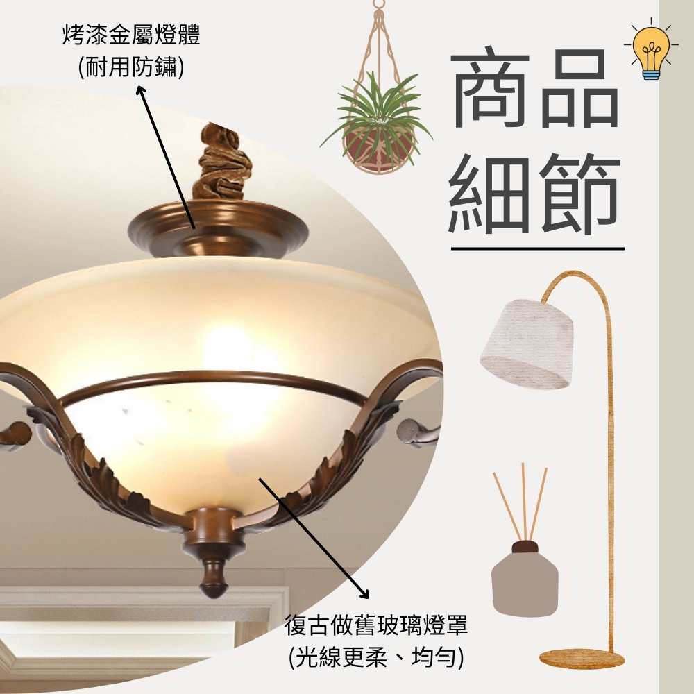 品名 特洛伊 3 燈吸/吊兩用燈 材質 金屬烤漆燈體 + 玻璃燈罩 尺寸 燈體直徑約45cm * 高約30cm * 吸頂盤直徑約15cm (吊鍊長度約80cm 可縮短調整) 光源 需另購E27*3 適用 適用約3-4坪