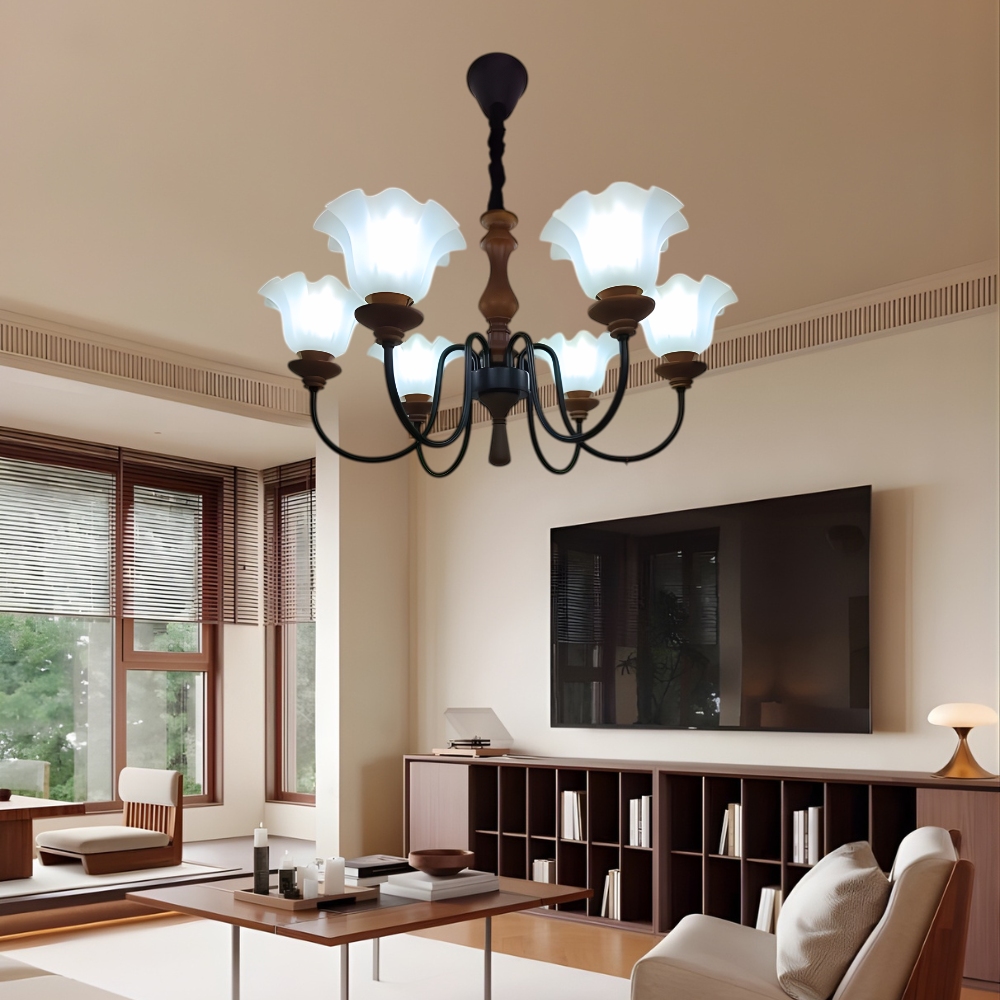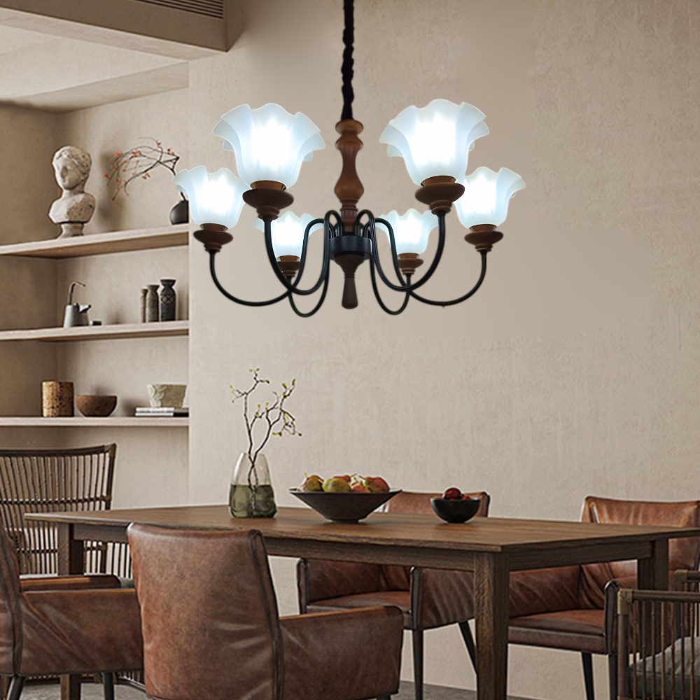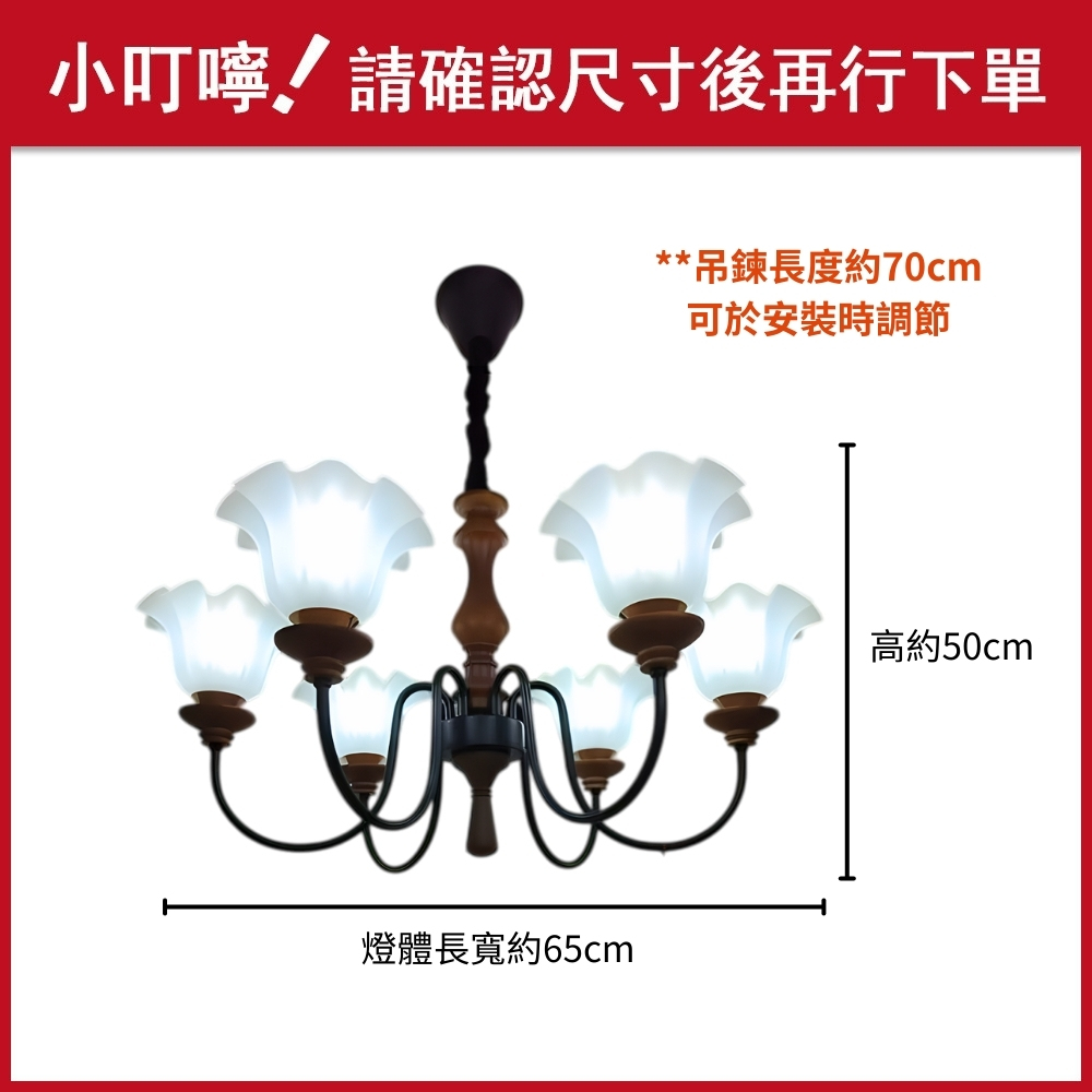 品名 錦繡 6IC 吸/吊兩用燈 材質 金屬/原木燈體 + 玻璃燈罩 尺寸 燈體直徑約65cm * 高度約50cm **吊鍊長度約70cm 可於安裝時調整 光源 另購E27*6 (附電子IC分段開) 適用 約6-8坪